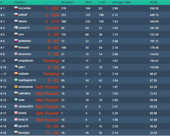 First of all we want to congratulate our winners in all the competitions. For the last month we accepted under 40% Hit Rate for the betors.club Tipster Competition and for Easy Skrill the normal of 30 picks. Also for Neteller we have made the statistics with over 23 hours because of DST change.