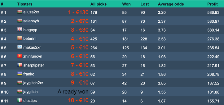To explain Pro 300 Tipster Competition, we will give the prizes in order for over 70% Hit Rate and after we will drop to over 60% Hit Rate and take it from the top.
